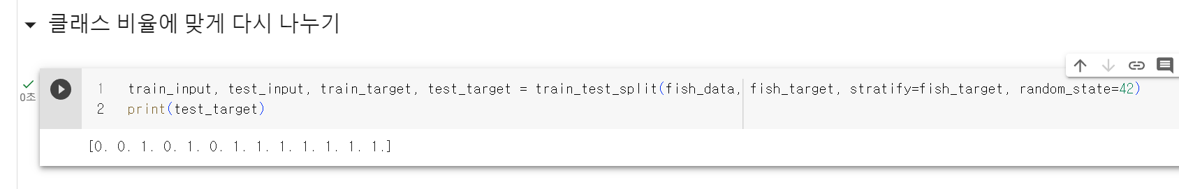 이건 train_test_split 에 stratify 라는 매개 변수에 타깃 데이터를 전달하면 클래스 비율에 맞게 데이터를 나눈다.