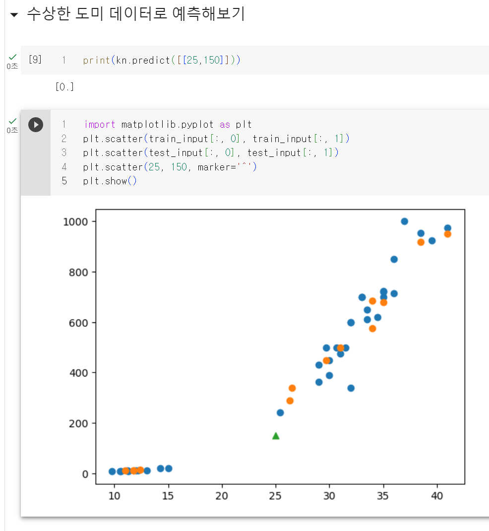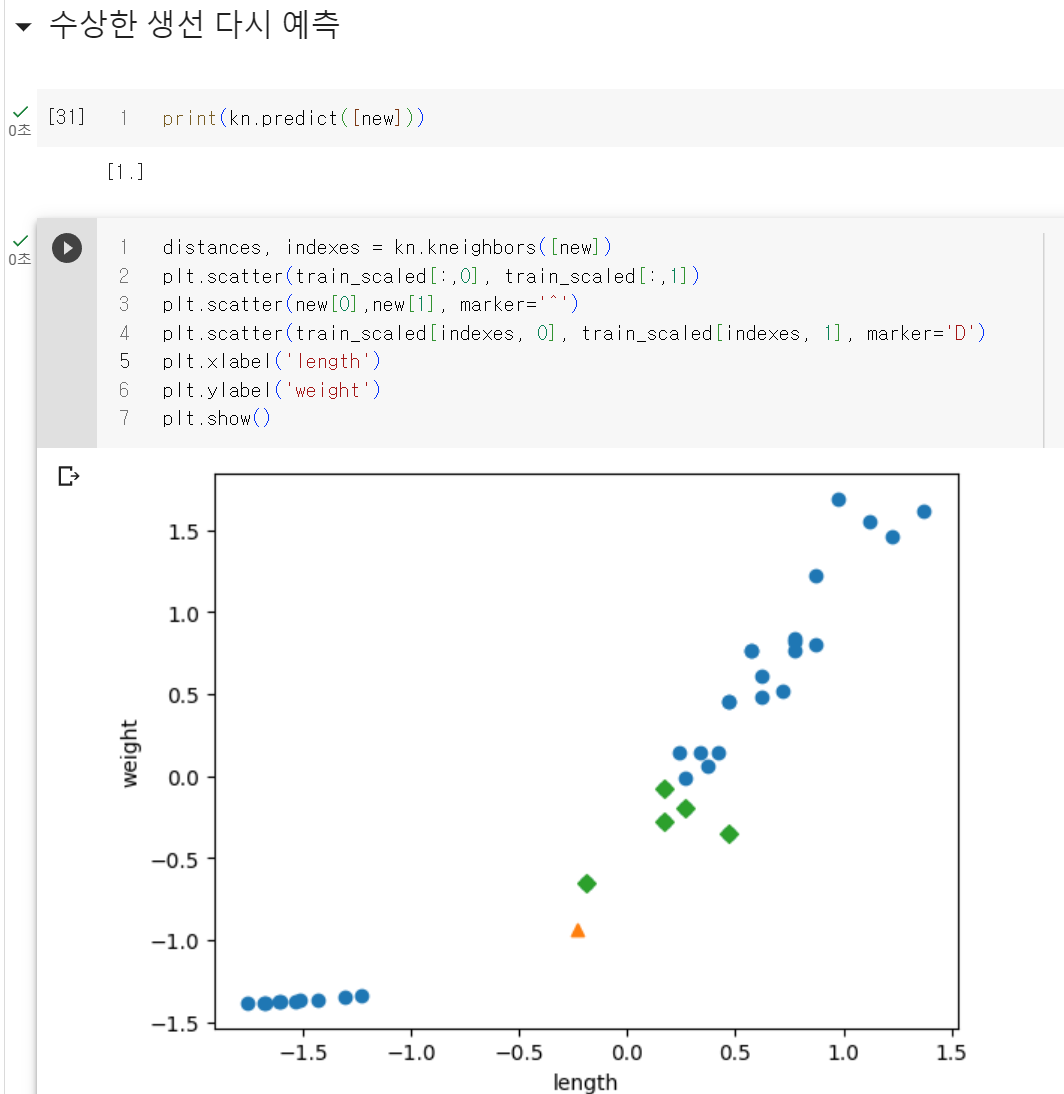 이제 모델이 제대로 세팅되었으니 다시 수상한 생선을 예측을 하고 그래프로 검증을 해보면