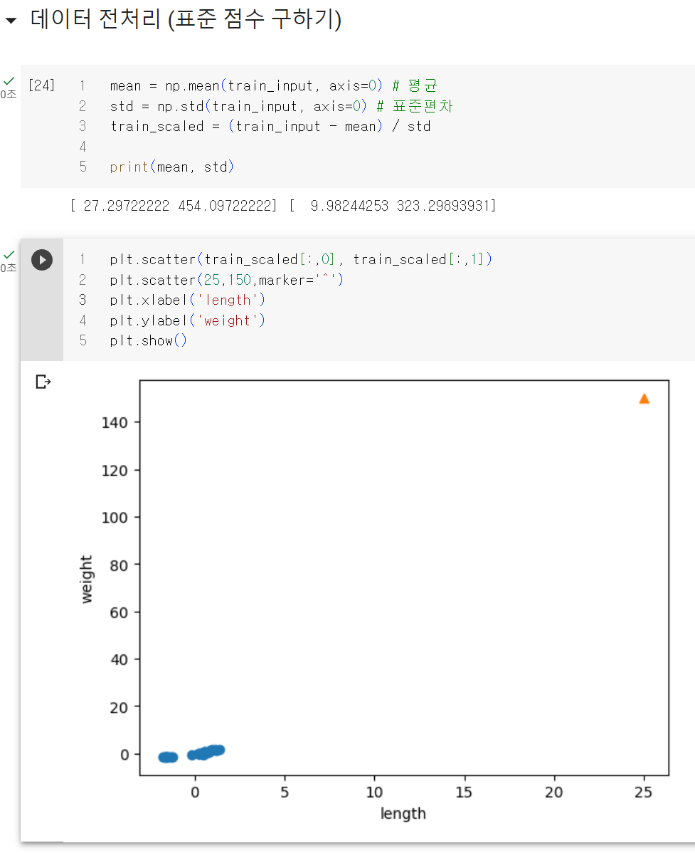 챕터 2-1 에서는 주어진 샘플을 훈련세트와 테스트세트로 나누어야 하는 이유와 랜덤처리를 위해 넘파이 라이브러리를 사용해봤다. 하지만 아직 데이터 입력 단계에서 할 일이 좀 더 남아있다. 사실 지금까지 한 작업은 무게와 길이의 스케일 범위가 틀리기때문에 제대로 작업한건 아니다. 그걸 맞춰가는 작업을 살펴보자.