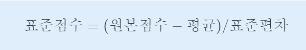 표준점수는 각 특성값이 평균에서 표준편차의 몇 배만큼 떨어져 있는지를 나타낸다. 이를 통해 실제 특성값의 크기와 상관없이 동일한 조건으로 비교할수 있다.