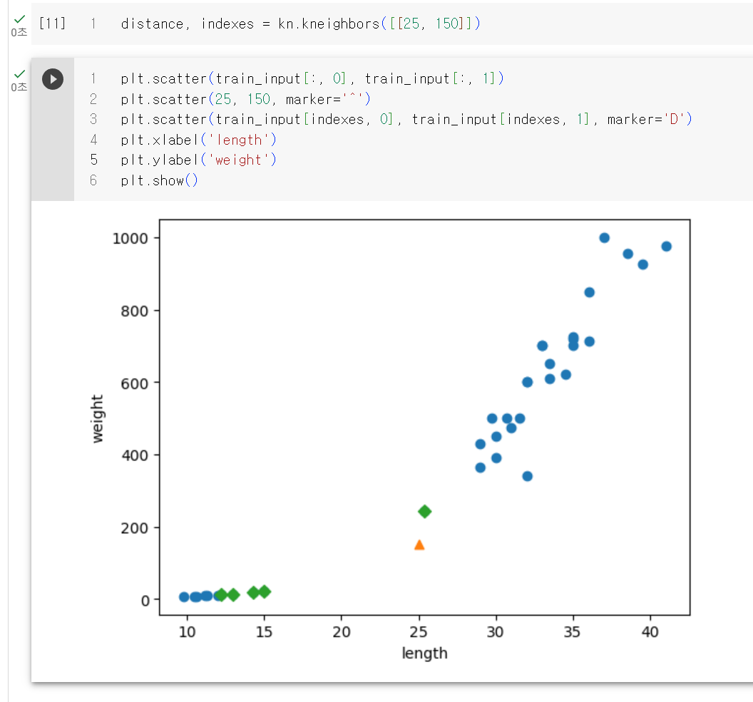 예측값은 빙어로 나와서 그래프를 찍어보면 그래프상에서는 맞는거 같다. 좀 더 체크해보자. 이 샘플의 주변데이터를 표시해보자