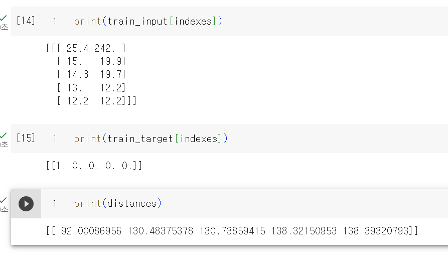 주변데이터 4개가 빙어로 표시된다. 산점도를 보면 직관적으로 도미와 가깝게 보이는데 이상하다. 책에서는 거리를 찍어보면서 답을 찾는다.