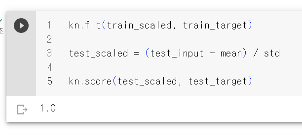 x축의 데이터(길이)는 가장 가까운 이웃을 찾는데 크게 영향을 미치지 못하는상황이다. y축의 데이터(생선의 무게)만 크게 영향을 미치게 된다.