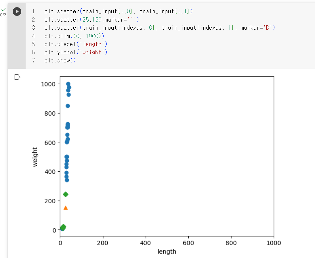 여기까지 기존 작업환경을 다시 세팅한것이고 수상한 도미의 데이터를 그래프로 확인해보자.