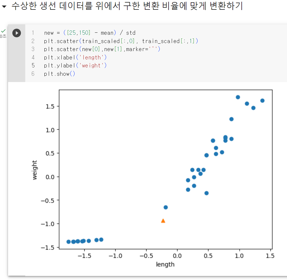 ### 수상한 생선 데이터를 위에서 구한 변환 비율에 맞게 변환하기