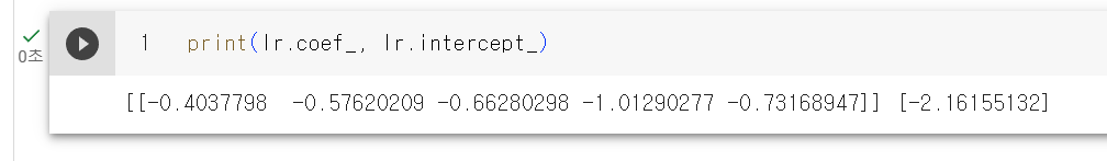 로지스틱 회귀로 성공적으로 이진분류를 수행했다. 학습한 계수를 확인해보자
