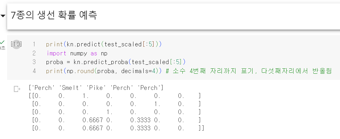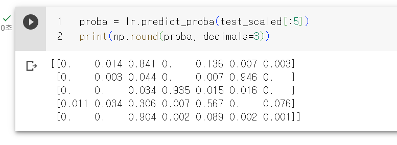 5개 샘플에 대한 예측이므로 5개의 행이 출력되었고 7개의 생선에 대한 확률을 계산했기 때문에 7개의 열이 출력되었다. 위에서 2진분류일때 2개의 열만 출력되었다.