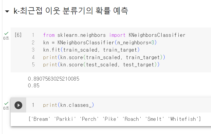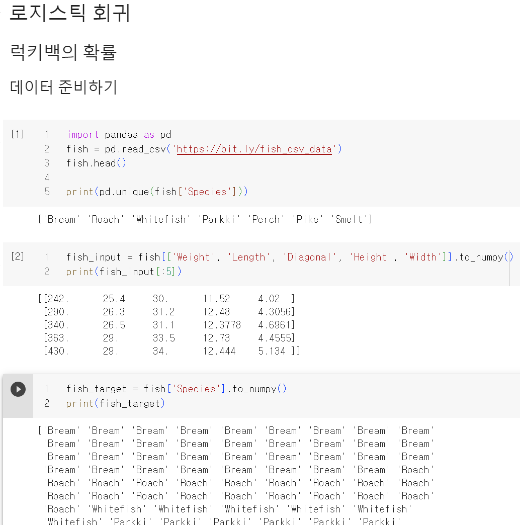 2장에서는 0, 1로 타깃데이터를 만들었지만 사이킷런에서는 문자열로 된 타깃값을 그대로 사용할 수 있다고 함. 하지만 타깃값을 그대로 사이킷런에 전달하면 순서가 자동으로 알파벳순으로 매겨짐. 그래서 위에서 물고기 종류를 보려고 출력했던 pd.unique(fish['Species']) 하고 순서가 틀림.