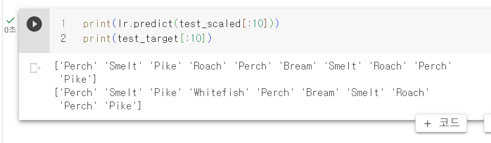 이로써 로지스틱 회귀를 사용해 7개의 생선에 대한 확률을 예측하는 모델을 훈련했다.