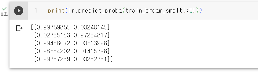 샘플마다 2개의 확률이 출력되었고 첫번째 열이 음성클래스에 대한 확률이고 두번째 열이 양성 클래스에 대한 확률이다. 위의 데이터와 비교해보면 음성이 도미, 양성이 빙어이다.