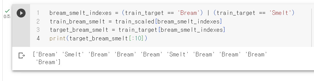 이렇게 비트연산자를 쓰면 도미와 빙어에 대한 행만 골라 낼수 있다.