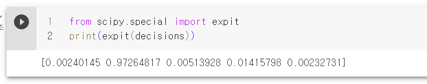 위 값을 사이파이의 소프트맥스 함수를 이용해서 계산하면