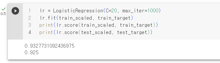 사실 사용법은 동일하다. 먼저 코드부터 보면서 얘기하자. 훈련세트와 테스트 세트에 대한 점수가 높고 과대적합이나 과소적합으로 치우진거 같진 않다.