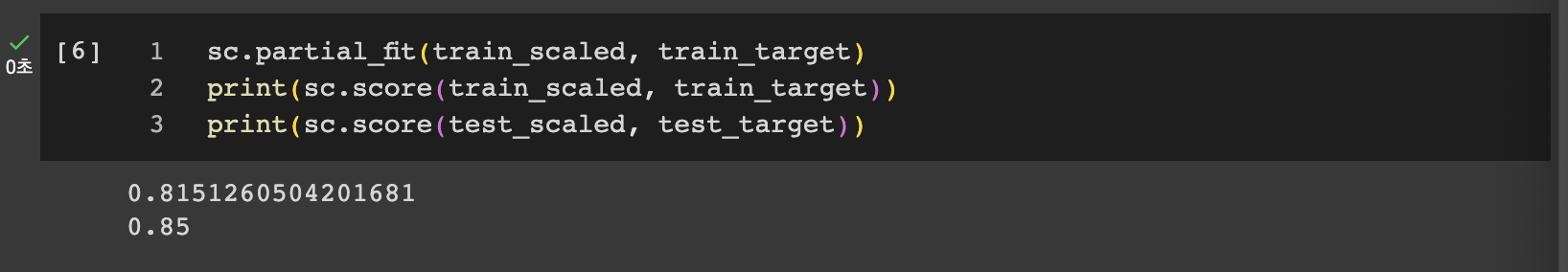 sc.partial_fit(train_scaled, train_target, classes=classes)