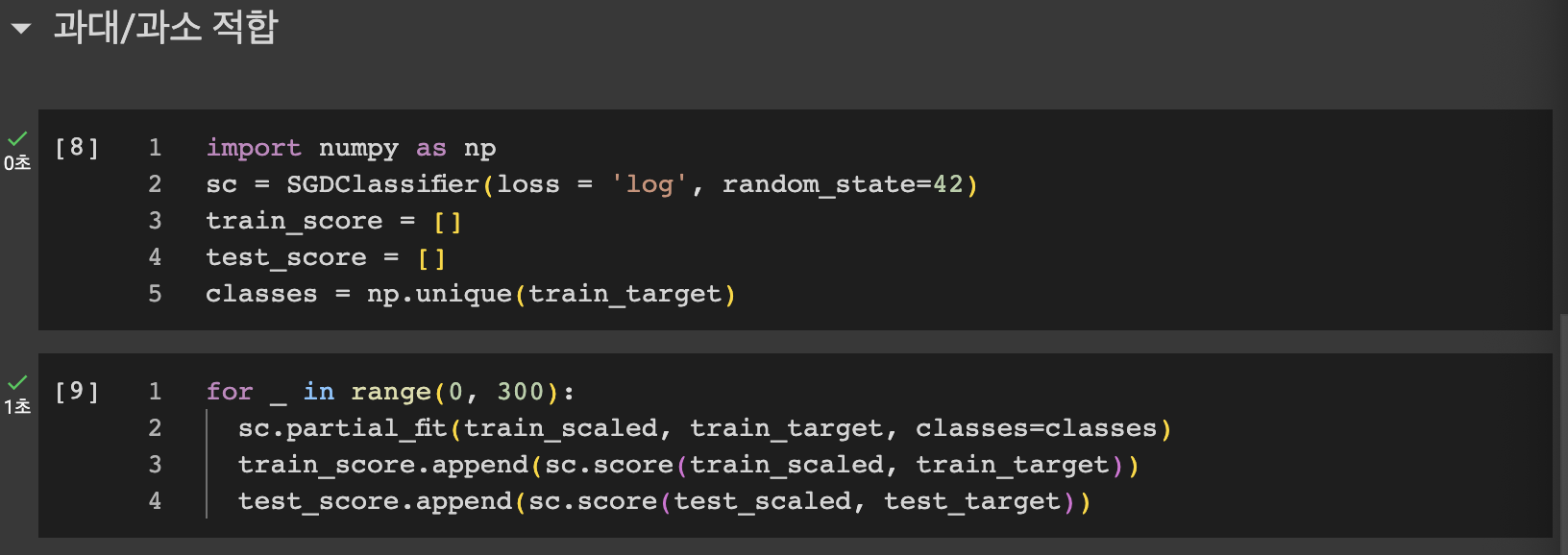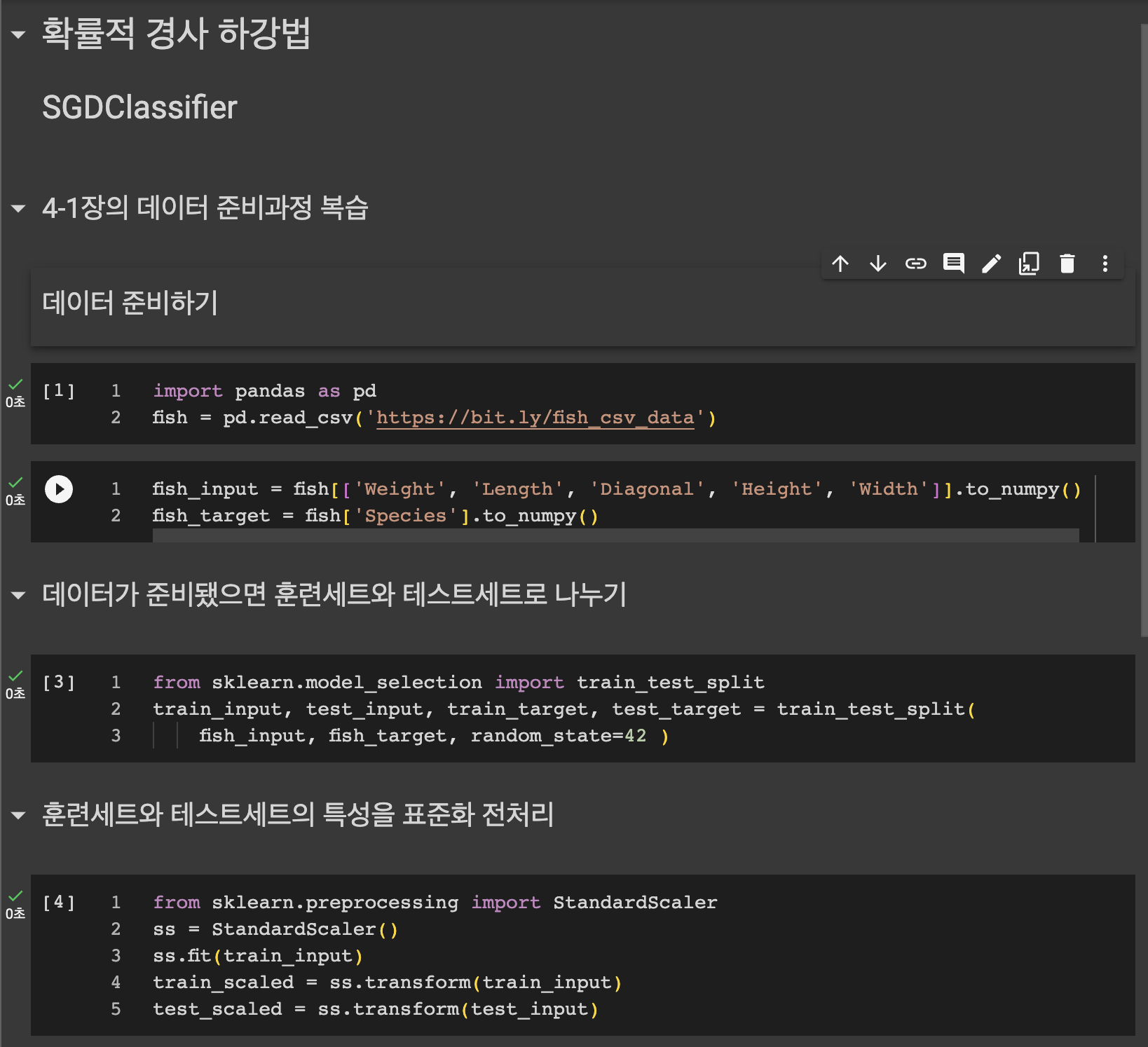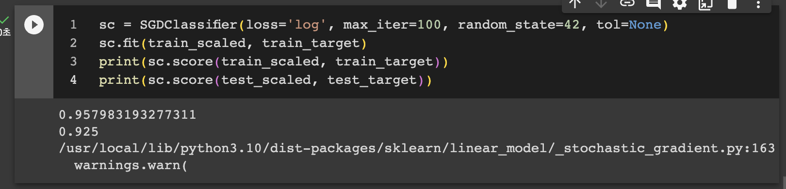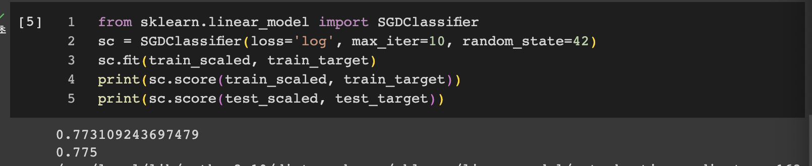 이제 사이킷런에서 제공하는 확률적 경사 하강법을 적용해서 학습하고 점수를 보자.