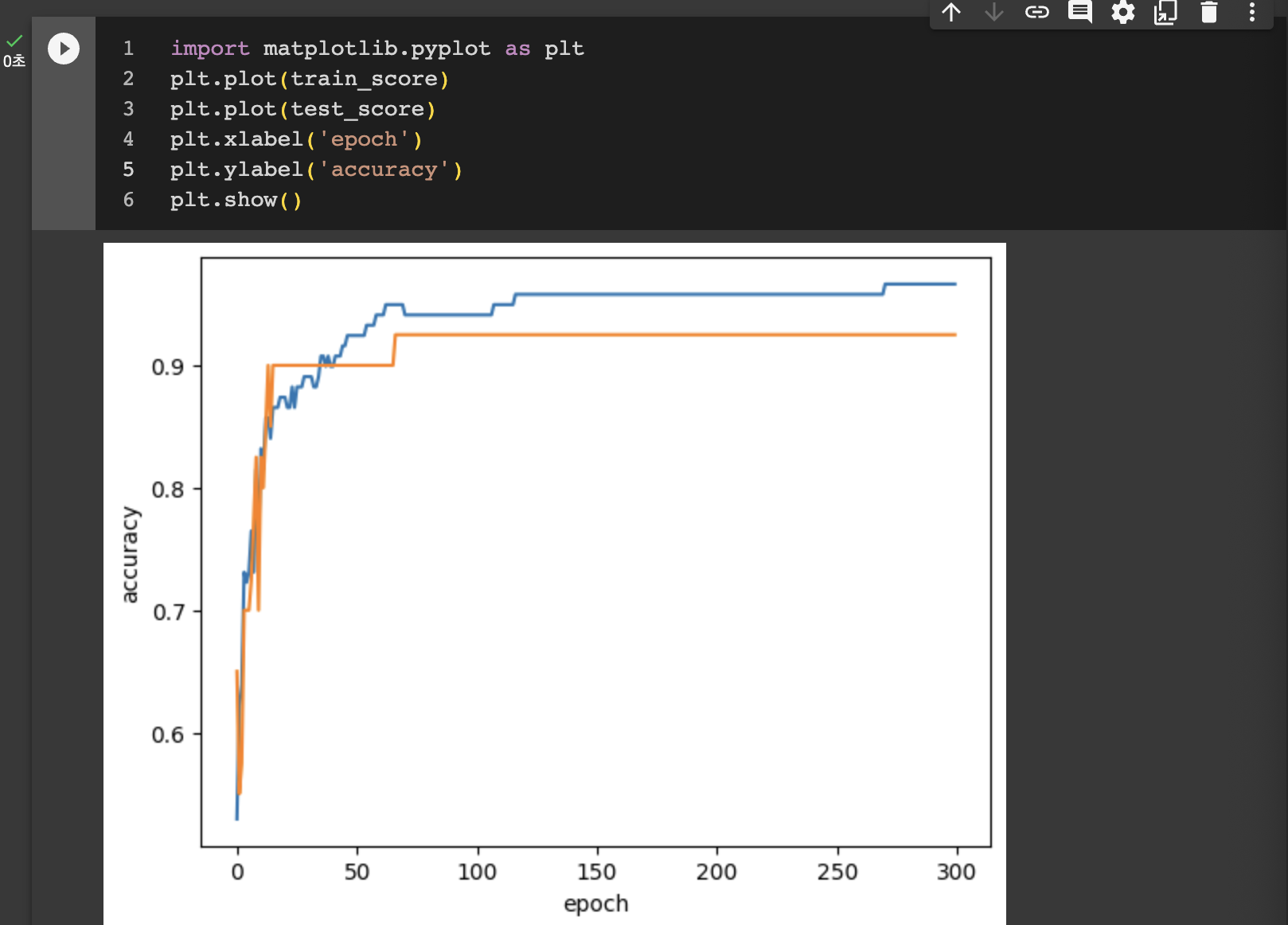 대략 백 번째 에포크 이후에는 훈련 세트와 테스트 세트의 점수가 조금씩 벌어지고 있다. 이 모델의 경우 백 번째 에포크가 적절한 반복 횟수로 보인다.