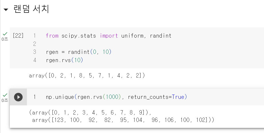 싸이파이는 파이썬의 과학 라이브러리 중 하나이다. 싸이파이의 stats 서브 패키지에 있는 uniform과 randint 클래스는 모두 주어진 범위에서 고르게 값을 뽑는다. 이를 '균등 분포에서 샘플링한다'라고 한다.