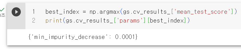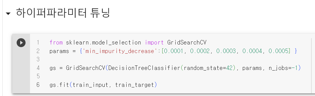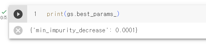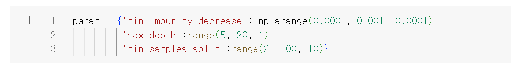 params = {'min_impurity_decrease':[0.0001, 0.0002, 0.0003, 0.0004, 0.0005] }
