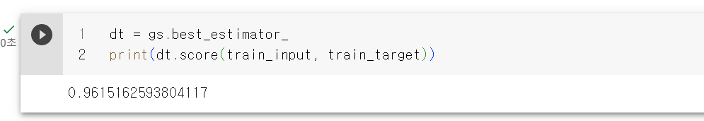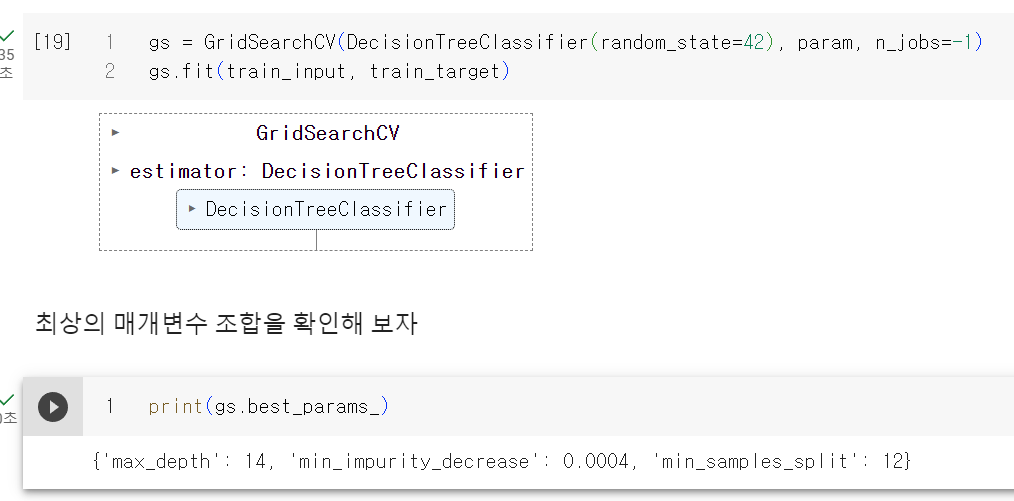 사이킷런의 GridSearchCV 클래스는 친절하게 하이퍼라라미터 탐색과 교차 검증을 한 번에 수행한다. 별로로 cross_validate() 함수를 호출할 필요가 없다. 그럼 어떻게 사용하는지 예를 보자.