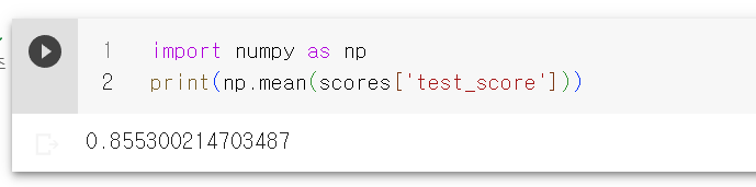 이 함수는 fit_time, score_time, test_score 키를 가진 딕셔너리를 반환하는데 처음 2개의 키는 각각 모델을 훈련하는 시간과 검증하는 시간을 의미한다. 이 함수는 기본적으로 5-폴드 교차 검증을 수행하기 때문에 각 키마다 5개의 숫자가 담겨있다. 교차 검증의 최종 점수는 test_score 키에 담긴 5개의 점수를 평균하여 얻을수 있다.