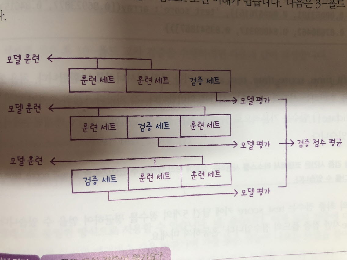 교차검증을 그림으로 나타내면 다음과 같다. 그림에서는 기본 훈련세트를 3등분한 3-폴드교차검증이다.