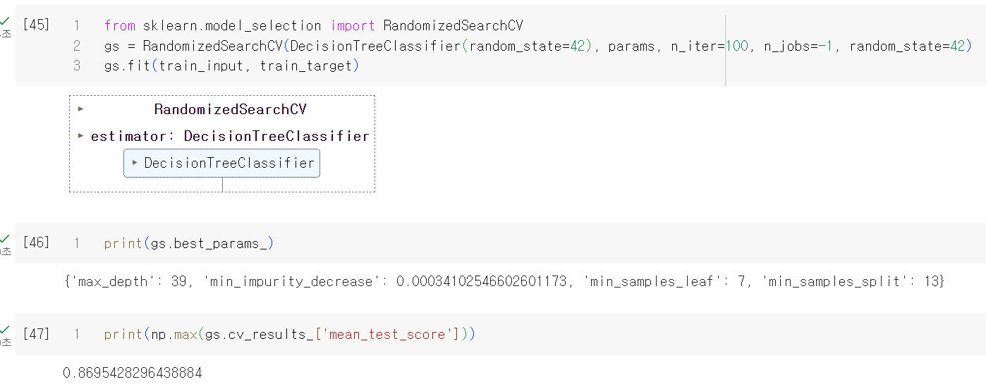 그런데 위에서 세팅한 값의 범위는 특별한 근거가 없이 정했는데 값의 범위나 간격을 미리 정하기 어려울 수 있다. 또 너무 많은 매개 변수 조건이 있어 그리드 서치 수행 시간이 오래 걸릴 수 있는데 이럴때는 랜덤 서치라는 것을 사용하면 좋다.
