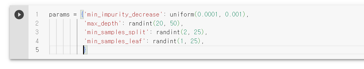 랜덤 서치에 randint와 uniform 클래스 객체를 넘겨주고 총 몇 번을 샘플링해서 최적의 매개변수를 찾으라고 명령할 수 있다.