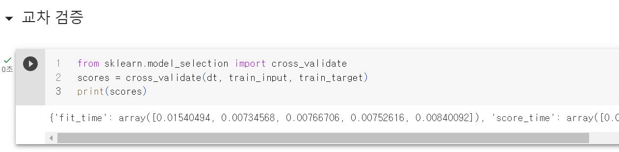 사이킷런에는 cross_validate() 교차 검증 함수가 있는데 사용법은 다음과 같다.