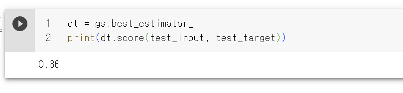 최적의 모델은 이미 전체 훈련 세틍로 훈련되어 best_estimator_ 속성에 저장되어 있다. 이 모델을 최종 모델로 결정하고 테스트 세트의 성능을 확인해보자.