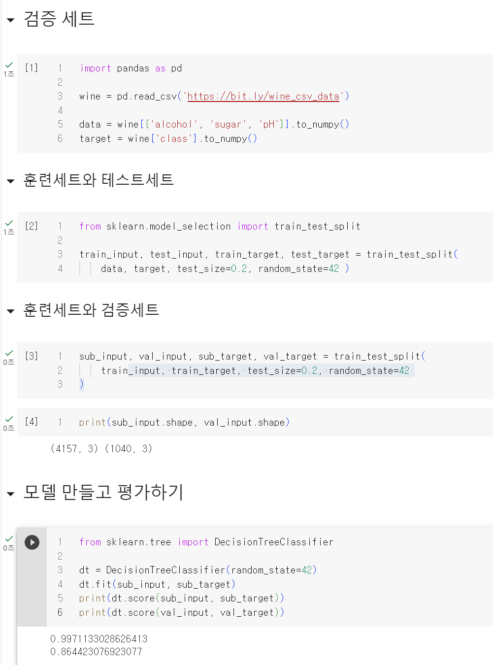그럼 어떻게 해야 할까? 훈련세트를 또 나누는 방법이 있다. 전체 데이터중에서 20%를 테스트 세트로 나머지 80%를 훈련세트로 사용했는데 여기서 훈련세트에서 다시 20%를 떼어 내어 검증세트로 만든다.