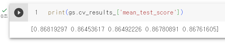 여기서는 0.0001이 가장 좋은 값으로 선택되었다. 각 매개변수에서 수행한 교차 검증의 평균 점수는 cv_results_ 속성의 'mean_test_score' 키에 저장되어 있다.