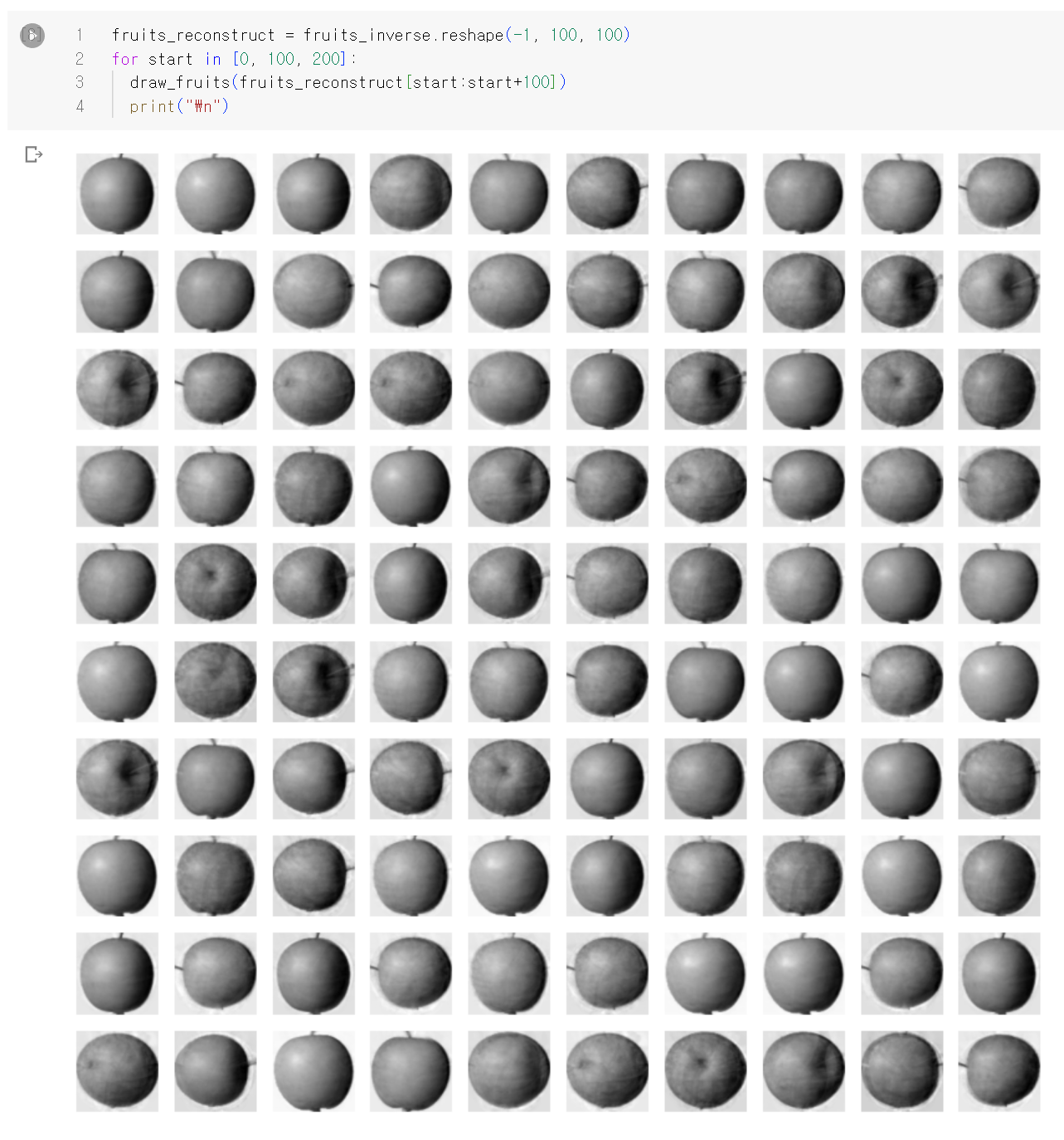 fruits_reconstruct = fruits_inverse.reshape(-1, 100, 100)
