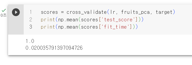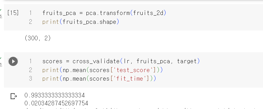 먼저 3개의 차원 축소 하기전의 과일 사진 분류을 잘 하는지 살펴보자. 먼저 정답이 없으므로 정답지를 준비하고 로지스틱 회귀모델을 사용하여 훈련하고 교차검증 및 시간체크를 해보자.
