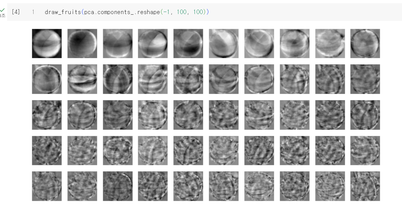과일 데이터 300개를 로드해서 PCA 클래스로 이미지를 학습시킨다. 그러면 PCA 클래스가 찾은 주성분의 크기를 출력해보면 50개의 주성분을 찾은걸 알 수 있다. 이렇게 찾은 주성분을 전 챕터에서 사용한 이미지 그리는 유틸을 이용해서 출력해보면 다음과 같다.