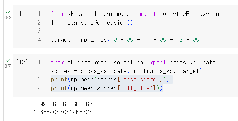scores = cross_validate(lr, fruits_2d, target)