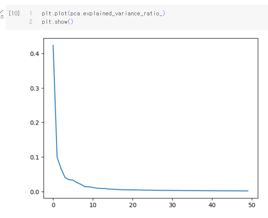 50개의 분산 비율을 모두 더하면 주성분으로 표현하고 있는 총 분산 비율을 얻을수 있는데 위에서 처럼 92%가 넘는 분산을 유지하기 때문에 원본 특성을 잘 간직하고 있다는걸 알수 있다. 50개의 특성에서 분산의 비율을 그래프로 그려볼수도 있다.