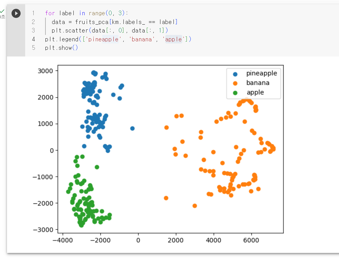 각 클러스터의 산점도가 아주 잘 구분되는걸 볼수 있다. 이 그림을 보면 사과와 파인애플 클러스터의 경계가 가깝게 붙어 있다. 이 두 클러스터의 샘플은 몇 개가 혼동을 일으키기 쉬울거 같다는 추측을 할수 있다.