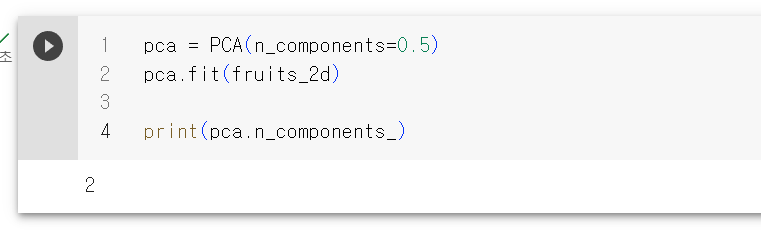 단 2개네. 2개의 특성만으로 원본 데이터에 있는 분산의 50%를 표현할 수 있다.