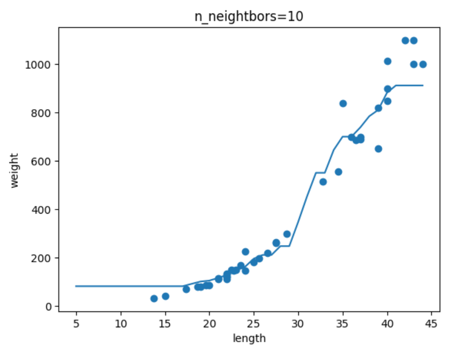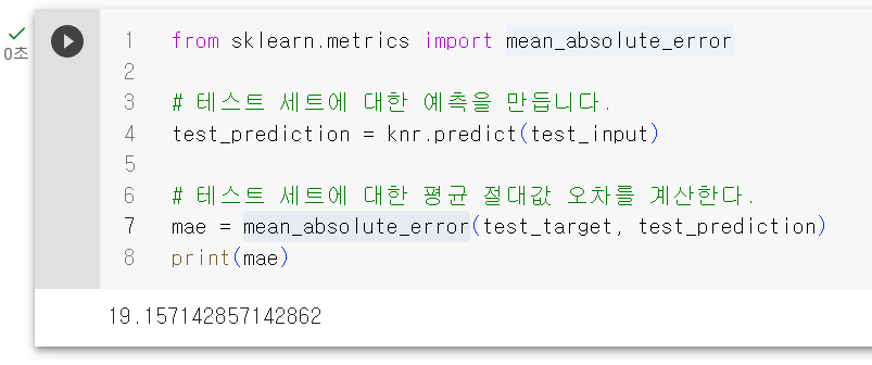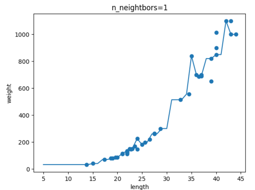 mean_absolute_error 라는 함수는 타깃과 예측의 절대값 오차를 평균하여 반환한다. 위 결과에서 19라는 값은 예측한 무게값과 19g 정도 차이가 있다는걸 알 수 있다.