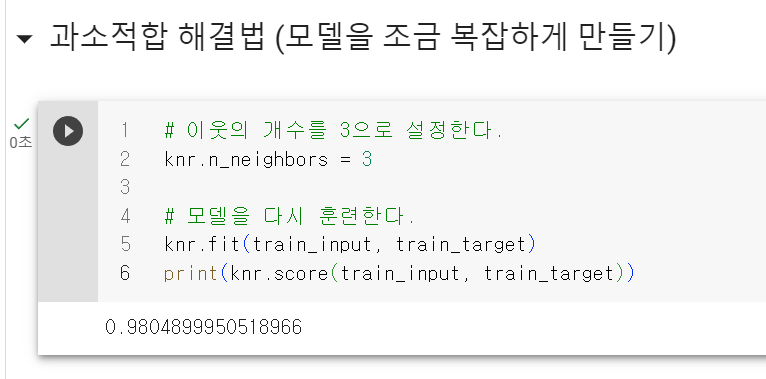 이럴때는 해결책으로 모델을 조금 더 복잡하게 만들면 된다고 함. KNeighborsRegressor 모델에서는 이웃의 개수를 줄이면 복잡해진다고 함. 기본값으로 5였는데 3으로 줄여서 다시 훈련하고 점수를 내보면