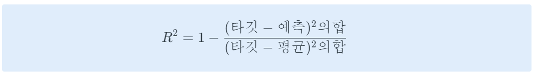 회귀에서는 정확한 숫자를 맞히는것은 거의 불가능하고 이 점수를 결정계수 ( R^2 )라고 부른다. 계산식은 아래와 같다.