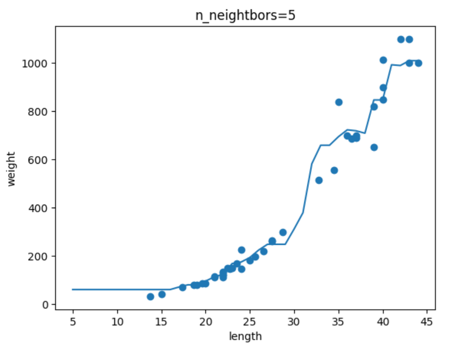 2. 과대적합과 과소적합에 대한 이해를 돕기 위해 복잡한 모델과 단순한 모델을 만들겠습니다. 앞서 만든 k-최근접 이웃 회귀 모델의 k값을 1, 5, 10으로 바꿔가며 훈련해 보세요. 그다음 농어의 길이를 5에서 45까지 바꿔가며 예측을 만들어 그래프로 나타내 보세요. n이 커짐에 따라 모델이 단순해지는 것을 볼 수 있나요?