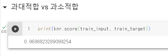 오히려 테스트 세트보다 점수가 떨어진 현상이 발생했다. 이렇게 훈련 세트보다 테스트 세트의 점수가 높거나 두 점수가 모두 너무 낮은경우를 과소적합 되었다고 말한다고 한다. 그 반대로 훈련 세트에서 점수가 굉장히 좋았는데 테스트 세트에서 점수가 굉장히 나쁘다면 과대적합 되었다고 한다.