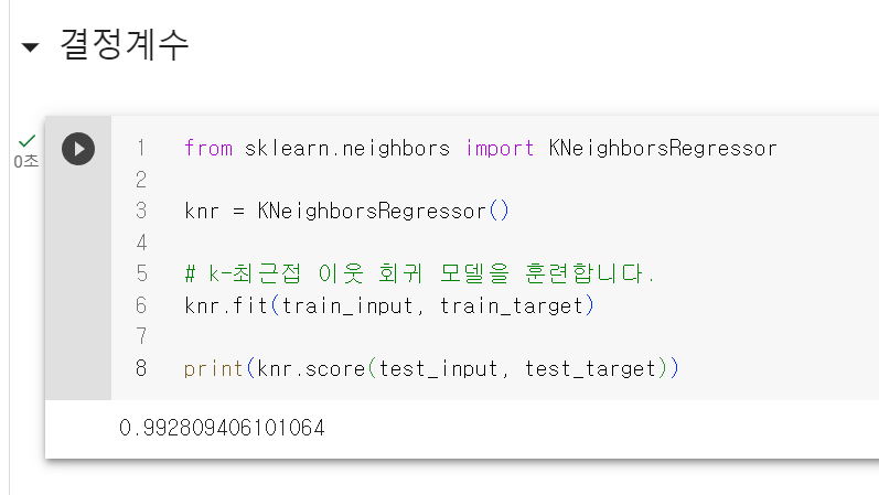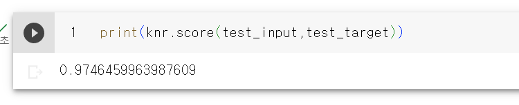 k-최근접 이웃 알고리즘으로 회귀를 적용한 클래스는 KNeighborsRegressor인다. 이는 도미와 빙어 분류시에 사용했던 KNeightborsClassifier와 비슷하다. 훈련을 해서 테스트를 하면 아래와 같은 점수가 나오는데