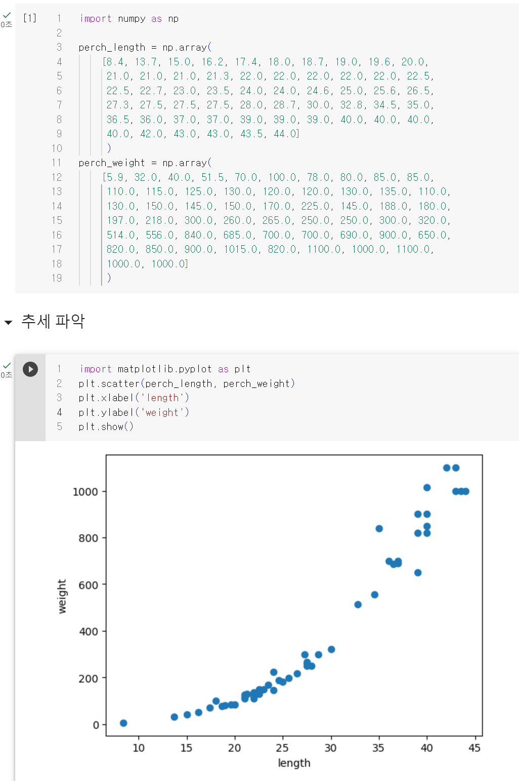 이번 챕터는 주어진 데이터로 농어의 무게를 예측하는 문제를 풀어나가는 챕터이다. 즉 이번 챕터는 특정값을 예측하는 문제(회귀 regression)이다.